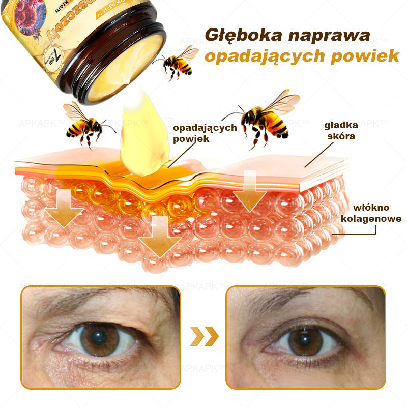 ΑPΚΑPK™ Jad Pszczoły Kompleksowy Krem łączy nowoczesną technologię z unikalnymi składnikami, aby skutecznie działać na opadające powieki i głęboko je regenerować. W przeciwieństwie do typowych produktów dostępnych na rynku, ΑPΚΑPK™ Jad Pszczoły Kompleksowy Krem nie tylko stymuluje produkcję kolagenu, poprawiając elastyczność delikatnej skóry wokół oczu, ale także wykorzystuje peptydy jadu pszczelego, które dokładnie naśladują działanie botoksu. Dzięki temu rozluźnia mięśnie wokół oczu i podnosi opadające powieki. Unikalna formuła głęboko penetruje skórę, wspomaga krążenie krwi, a razem z głęboko nawilżającym działaniem kwasu hialuronowego zapewnia, że skóra wokół oczu wygląda pełniej i bardziej jędrnie. Skutecznie redukuje opadające powieki, nadając oczom młodszy, jędrniejszy wygląd. Wybierz ΑPΚΑPK™ Jad Pszczoły Kompleksowy Krem, aby doświadczyć prawdziwej innowacji w pielęgnacji skóry i całkowicie pożegnać się z opadającymi powiekami.