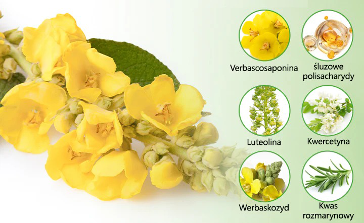 Verbaszkozaponina (główny środek wykrztuśny): 12,5 mg – wspomaga naturalne usuwanie śluzu