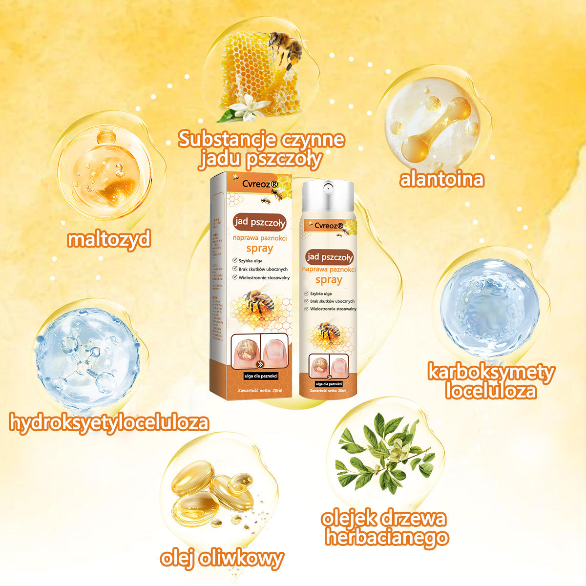 Spray naprawczy do paznokci Cvreoz® z jadem pszczelim skutecznie odnawia i pielęgnuje paznokcie dzięki unikalnej formule sprayu. Ten innowacyjny produkt zapewnia widoczne rezultaty i poprawia wygląd oraz ogólny stan zdrowia paznokci. Poznaj moc jadu pszczelego i odmłodź swoje paznokcie.